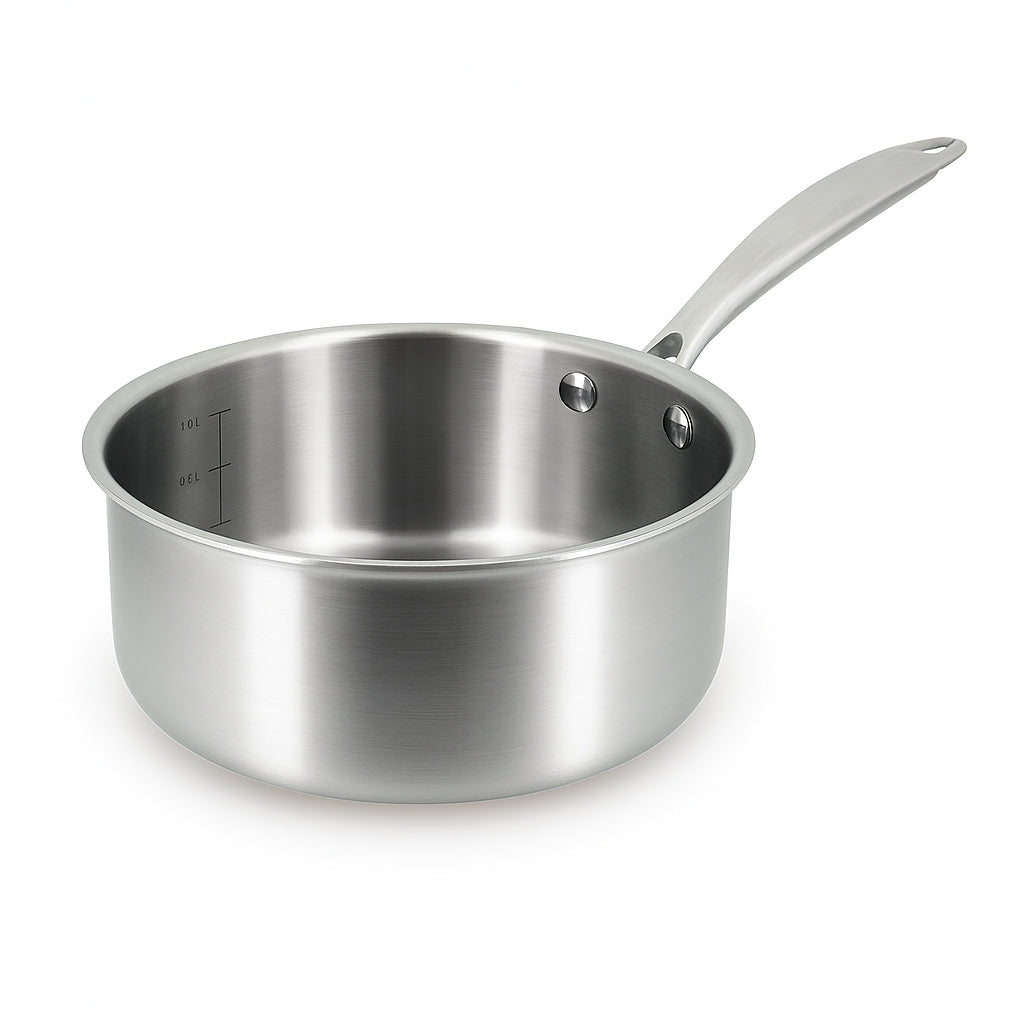This saucepan is made of 18/10 stainless steel, a very healthy material that preserves the flavor of food and distributes heat evenly over the entire product (and not just the bottom) thanks to the inner aluminum layer.