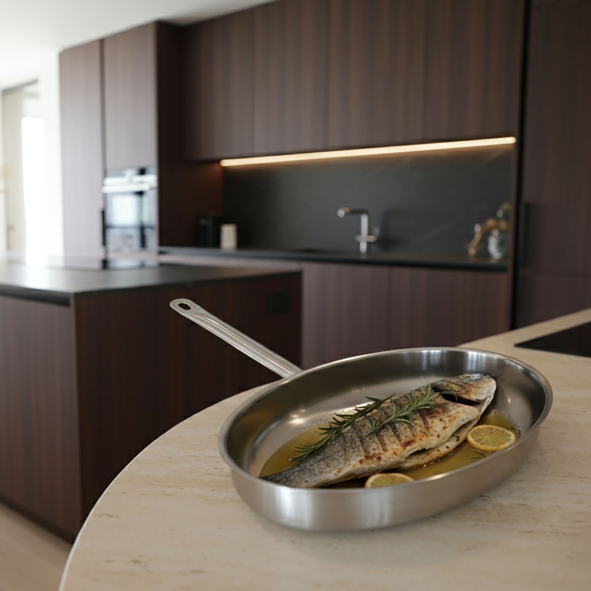 This 30cm stainless steel frying pan is a high-quality professional frying pan. Made entirely of stainless steel, the frying pan is reinforced, equipped with a professional tubular handle (non-heat-conducting) and a thick sandwich base. It is suitable for all hobs, including induction.