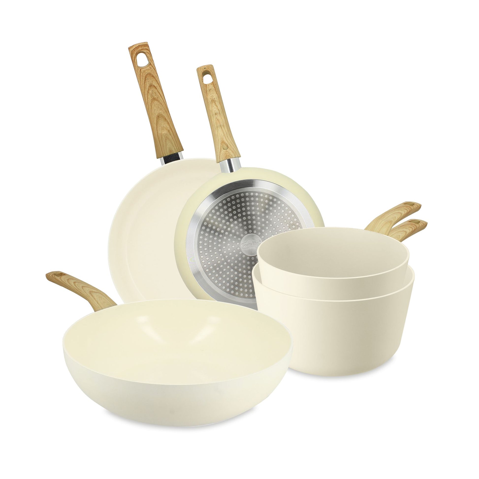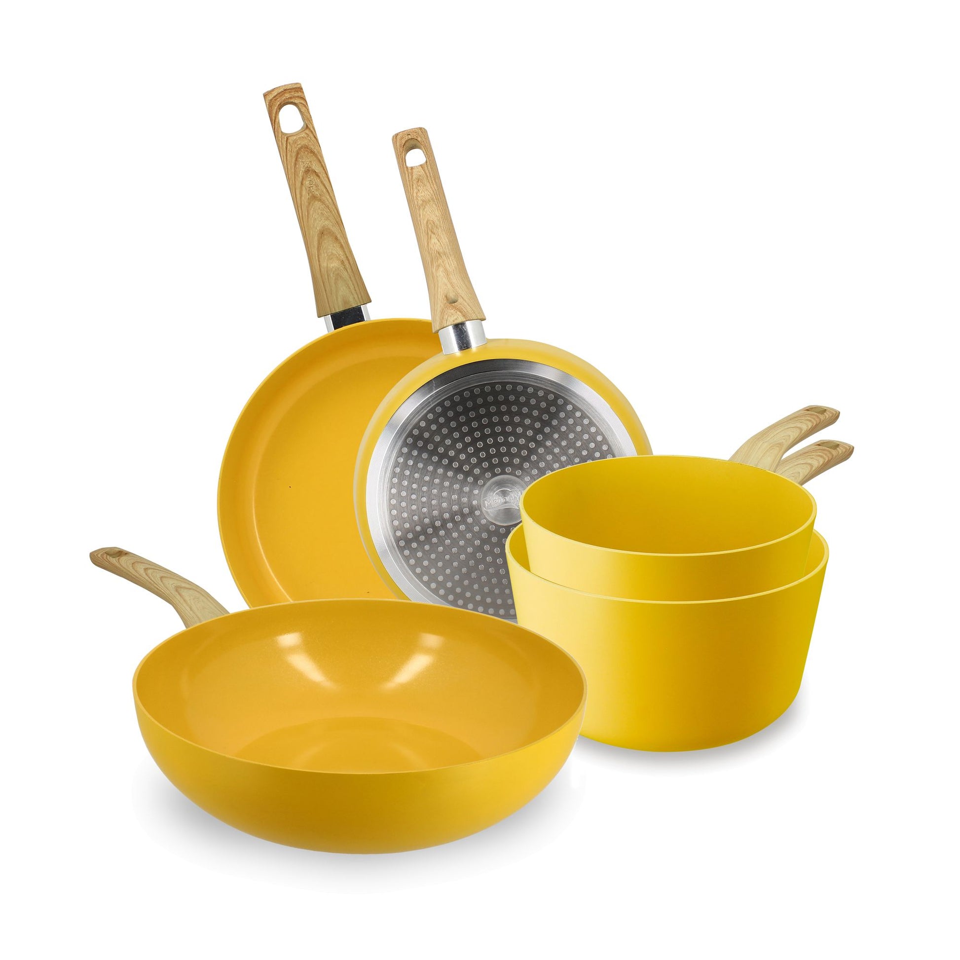 - This set consists of two saucepans measuring 16 and 20 cm, two frying pans measuring 24 and 28 cm and a wok measuring 28 cm.
