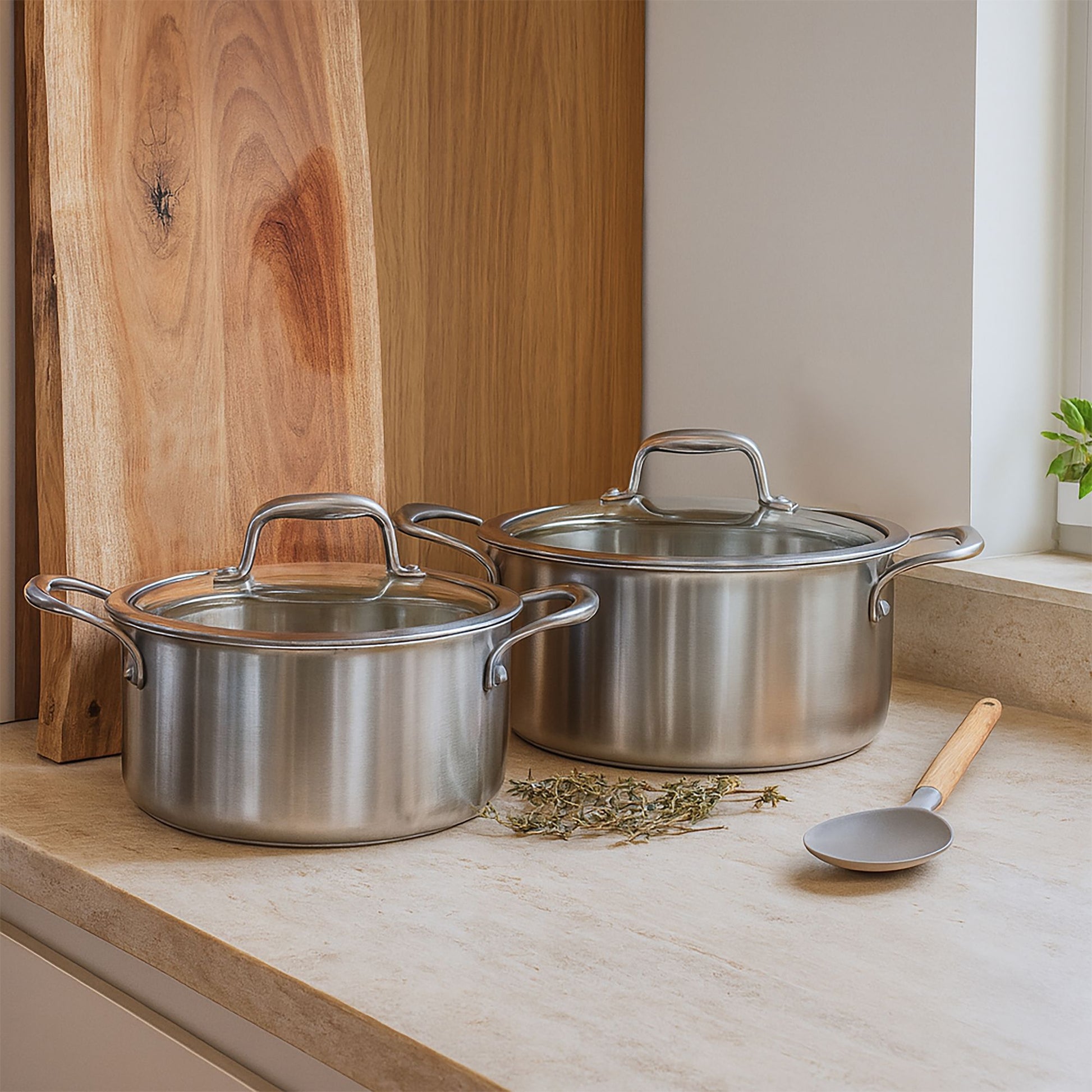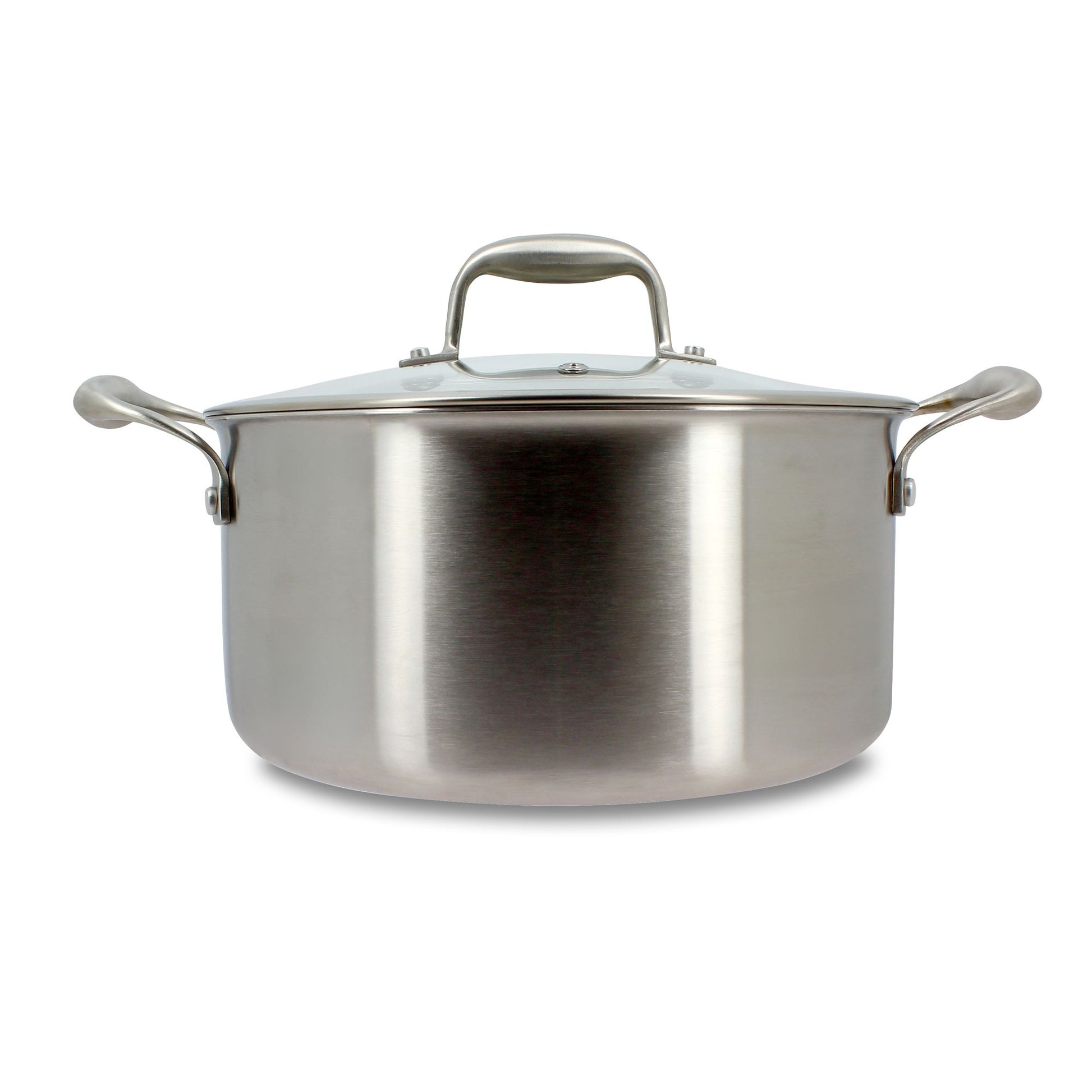 CUISSON HOMOGÈNE ET RAPIDE : Grâce à sa structure robuste en 3 couches (inox 304, aluminium et inox 430), la batterie de cuisine en acier inoxydable Trinox assure une diffusion uniforme, précise et rapide de la chaleur, du fond jusqu'aux bords.