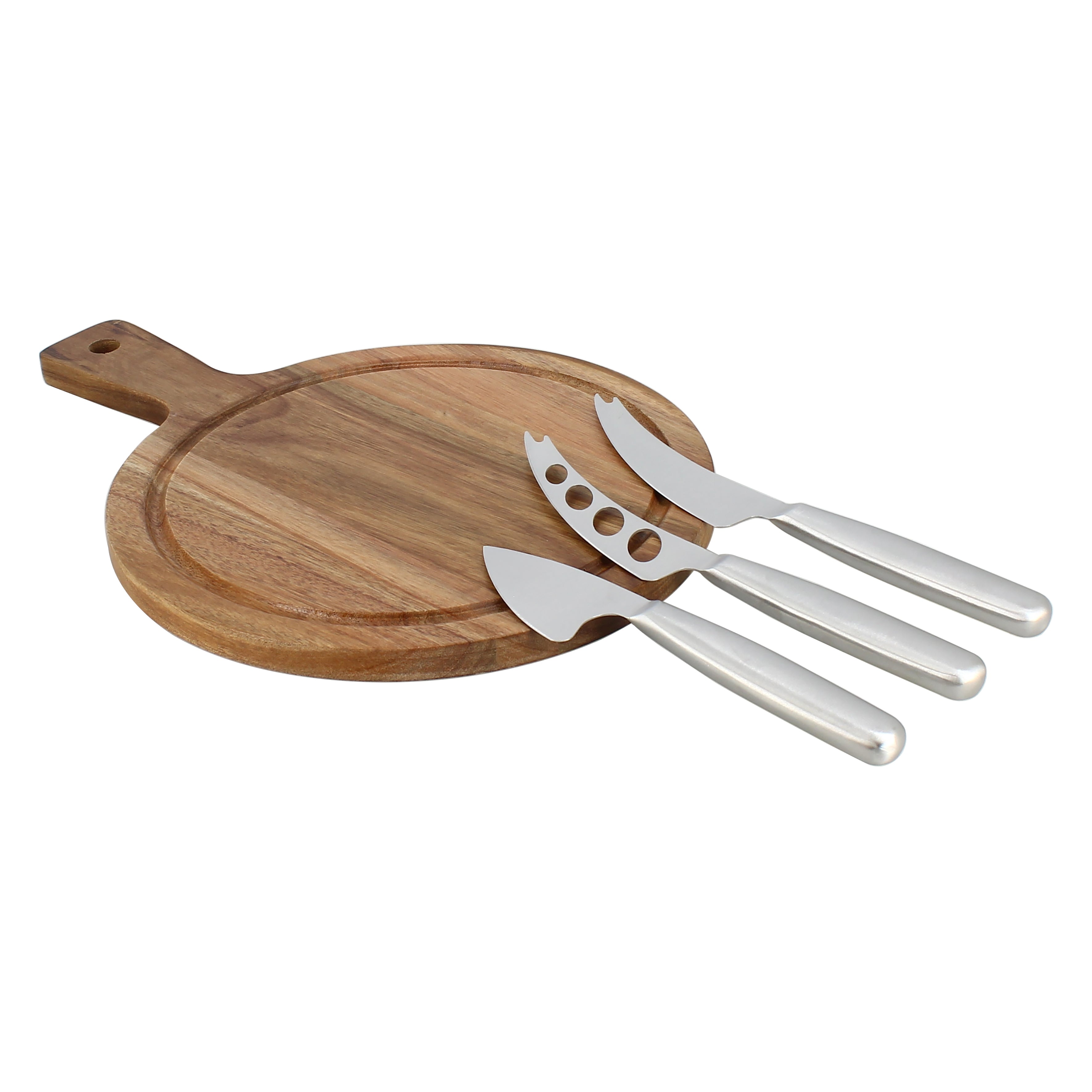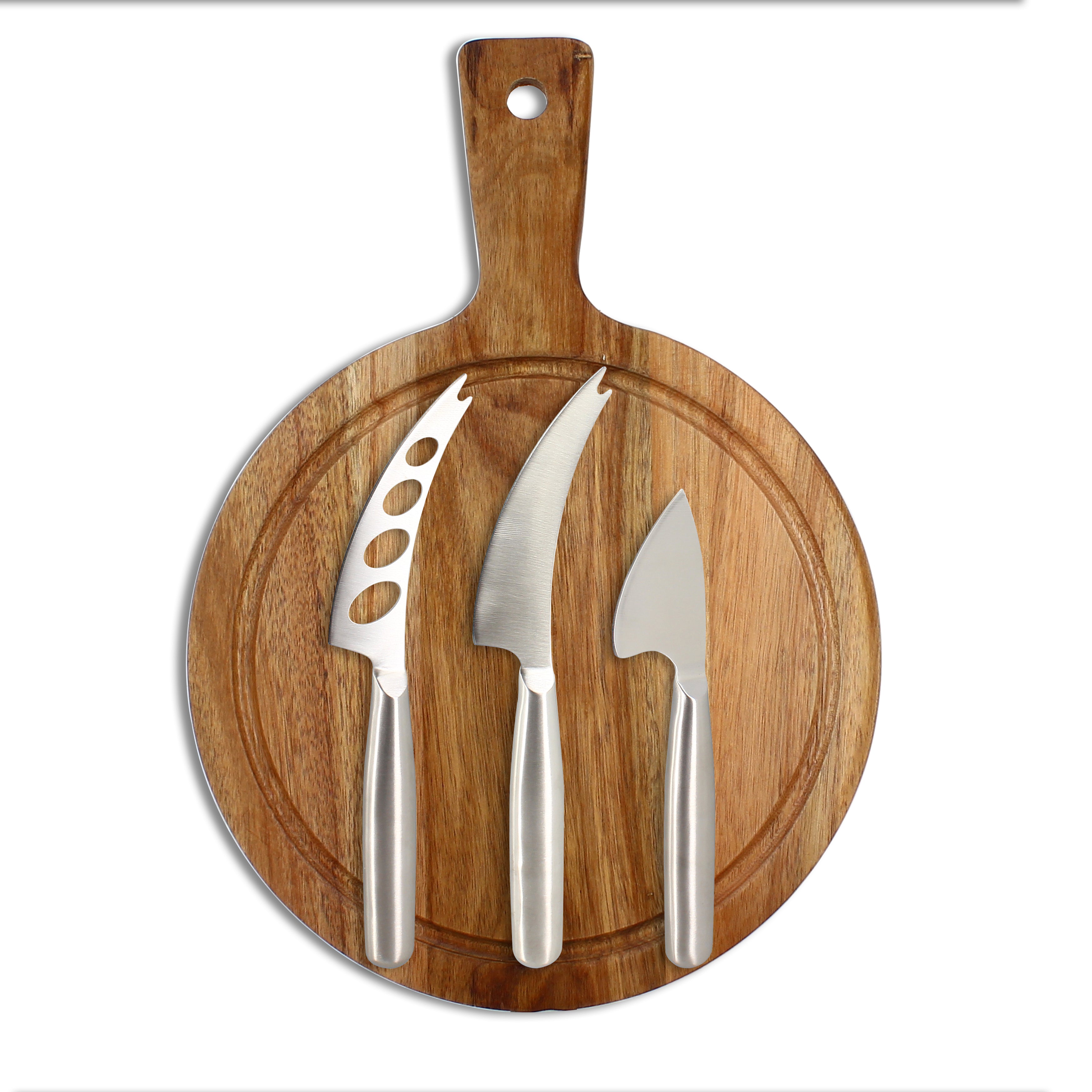 Planche à Découper Ronde Acacia Ø24 cm + 3 Couteaux à Fromage