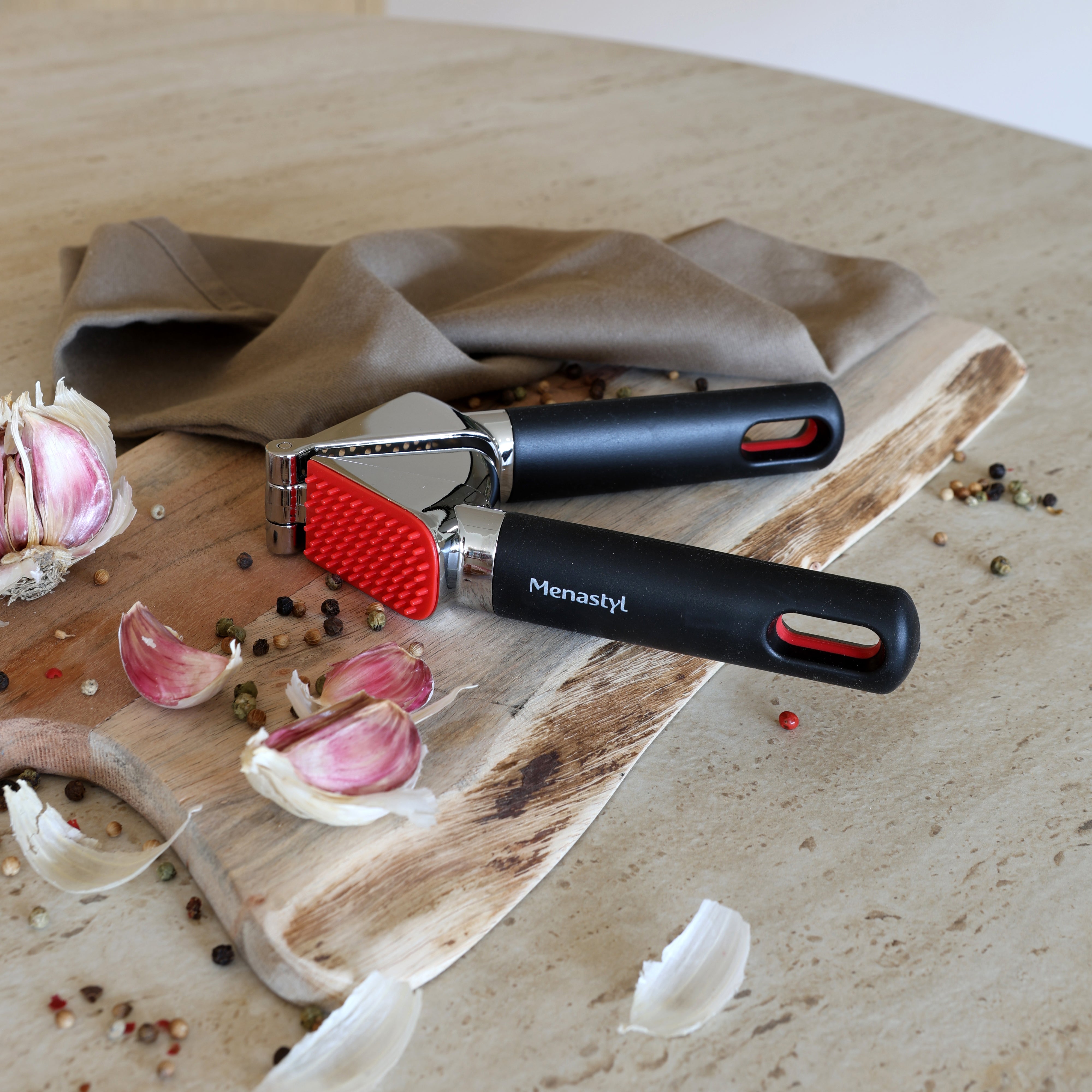 Presse-ail en métal avec manche en plastique noir