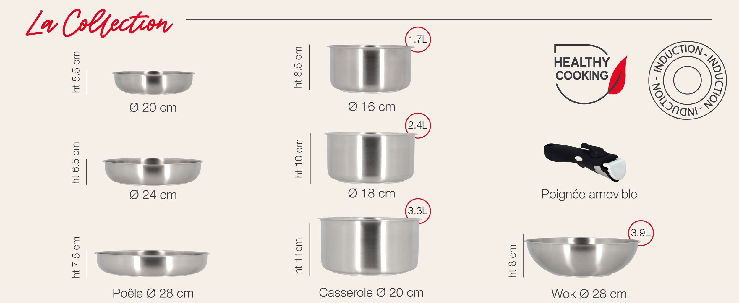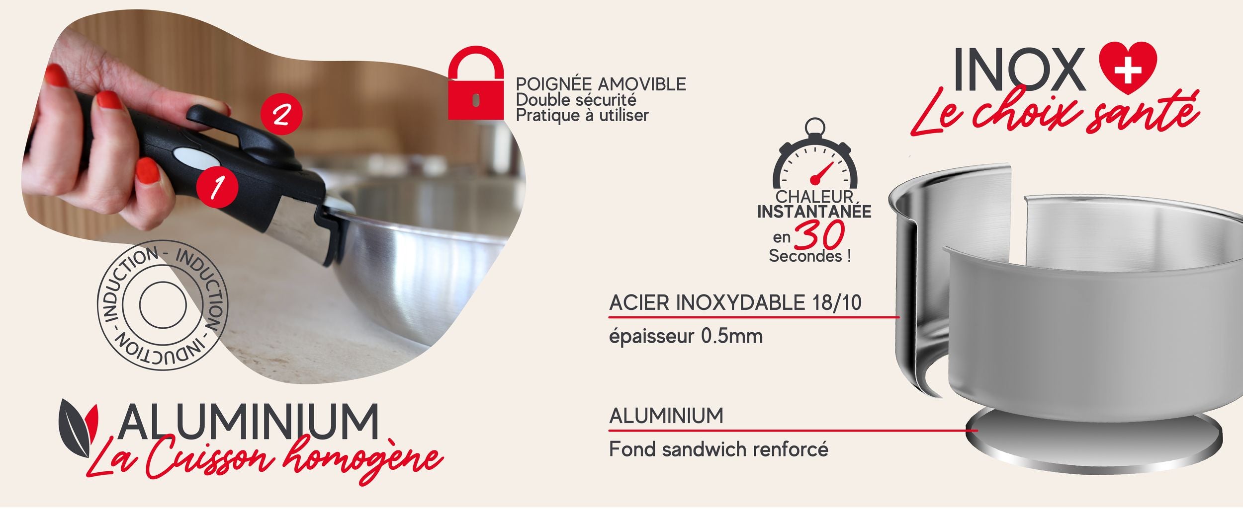 Grâce à la poignée amovible en bakélite et silicone, un simple clic suffit pour fixer ou détacher la poignée : cuisinez en toute sécurité, passez du feu au four, puis au réfrigérateur, et profitez d’un rangement optimisé.