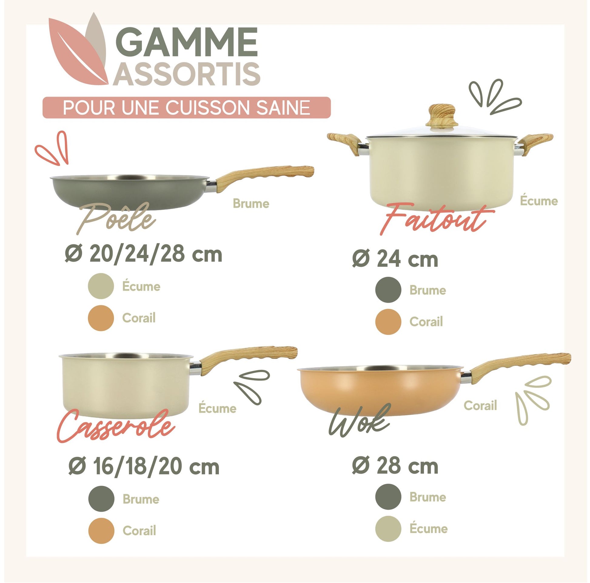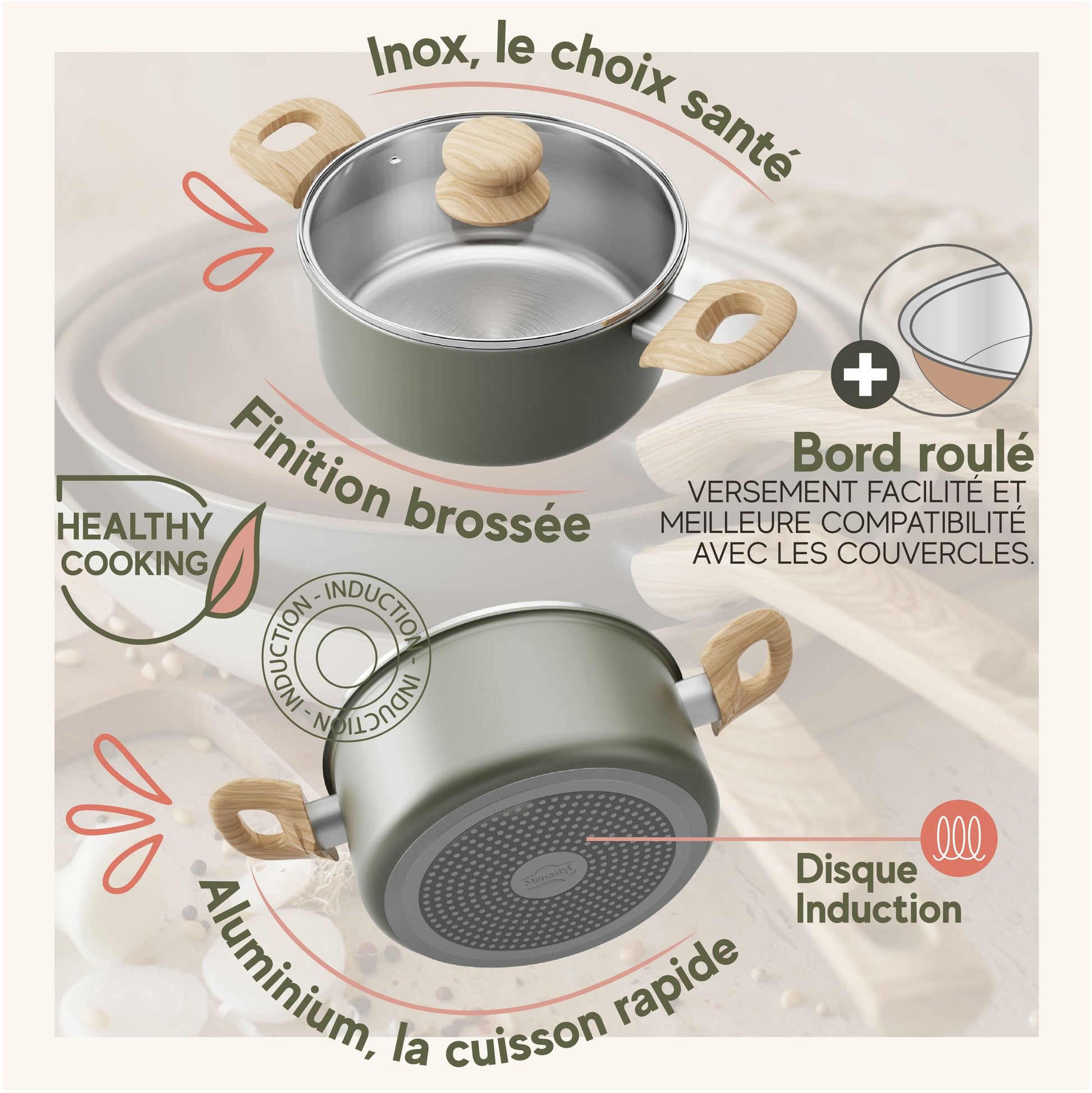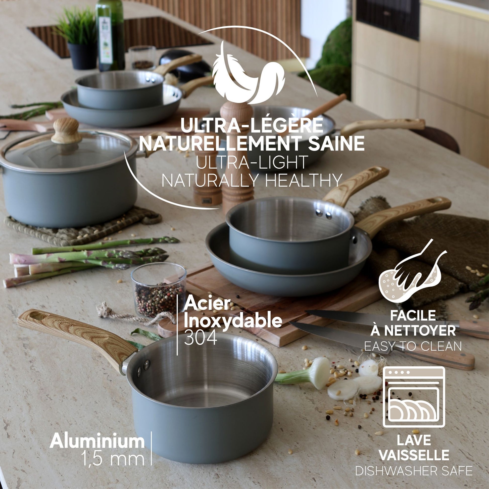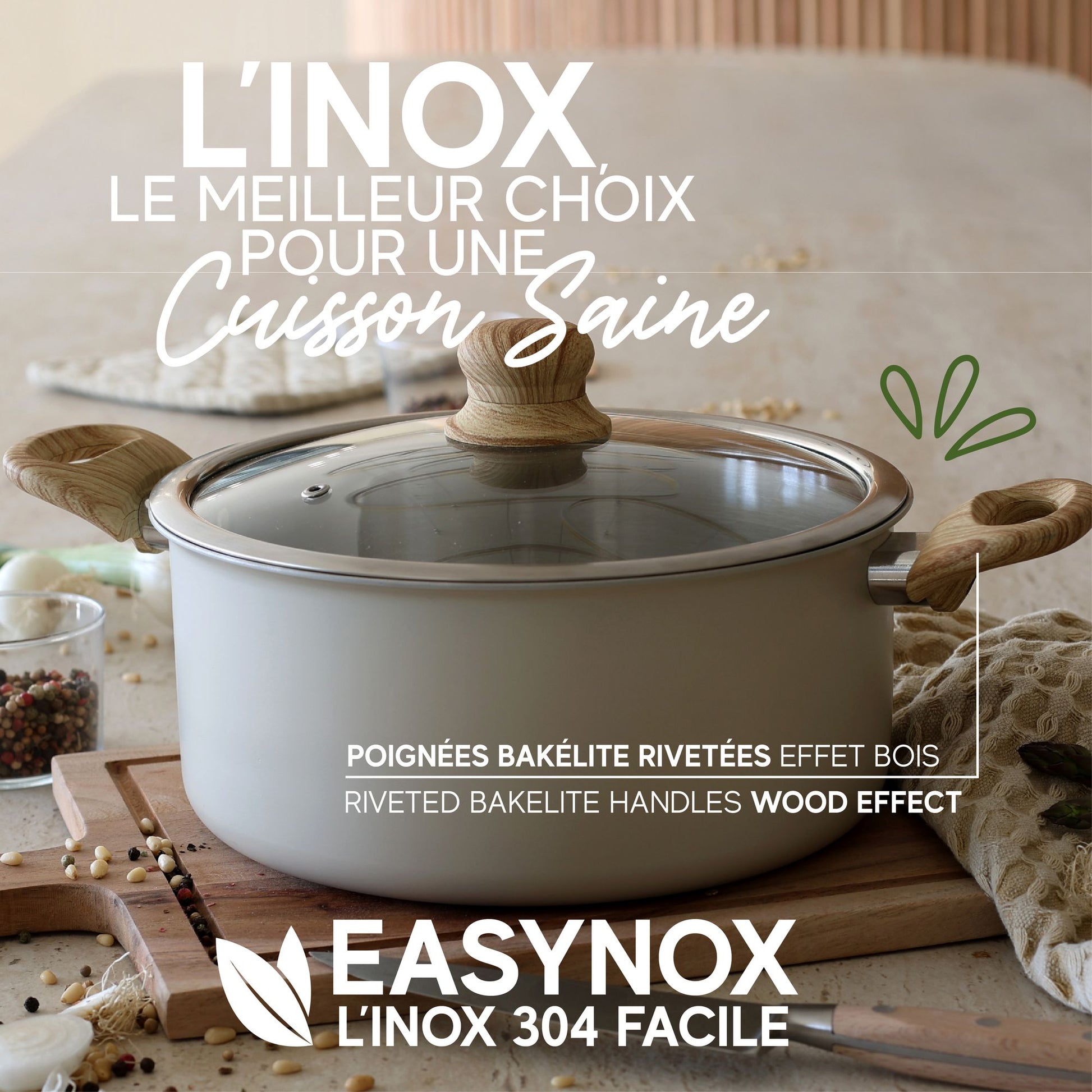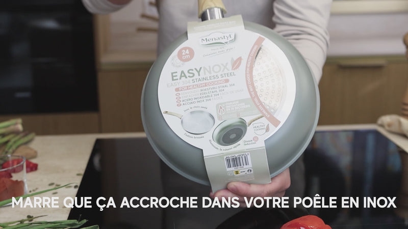 Avec sa finition inox brossé, ses poignées effet bois rivetées et ses trois coloris modernes (Brume, Corail, Écume), Easynox est une gamme parfaite au quotidien, compatible tous feux dont induction et lave-vaisselle.