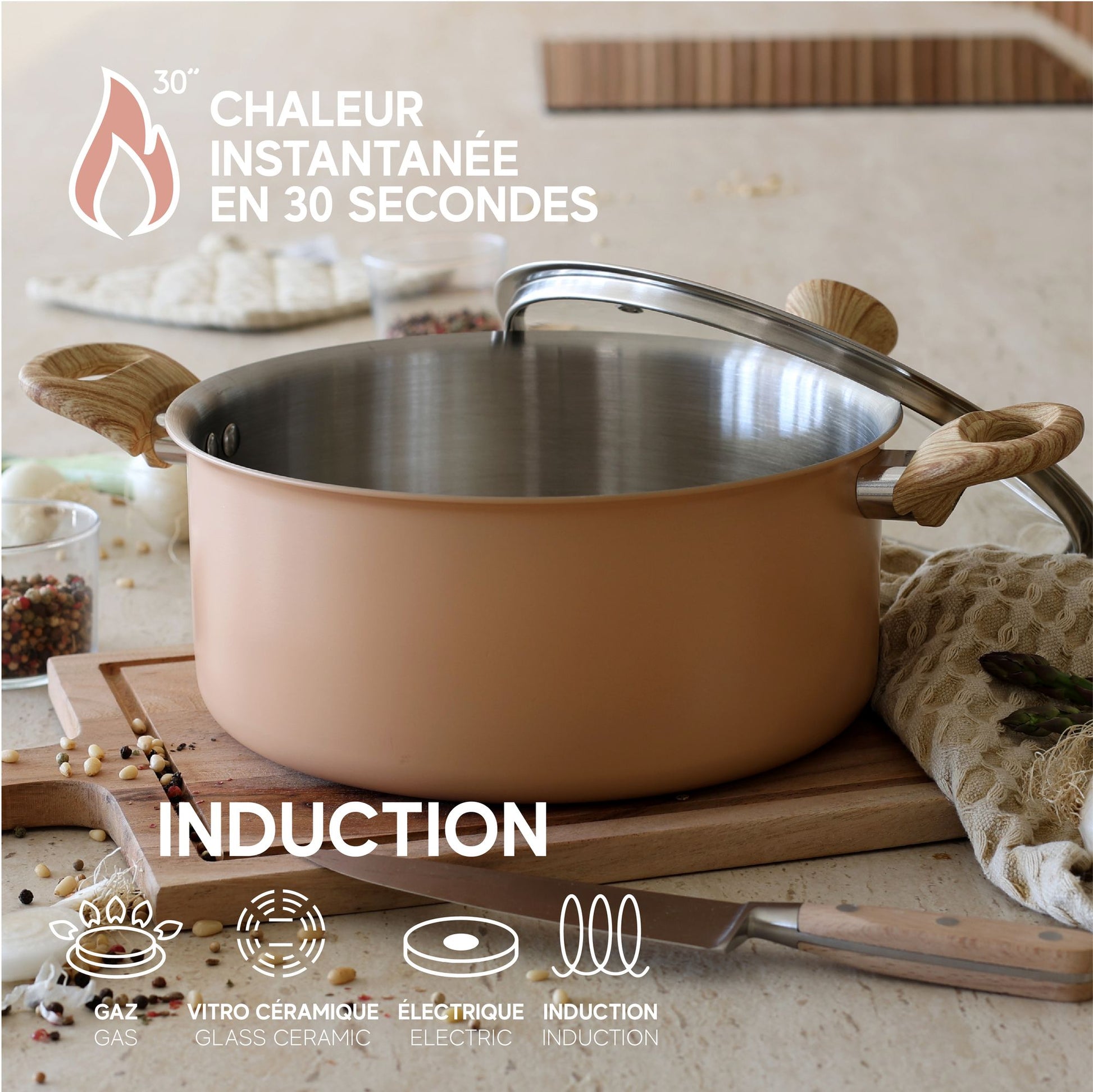 Grâce à son disque induction, la gamme s'adapte à toutes les sources de chaleur : gaz, vitrocéramique, induction, etc.