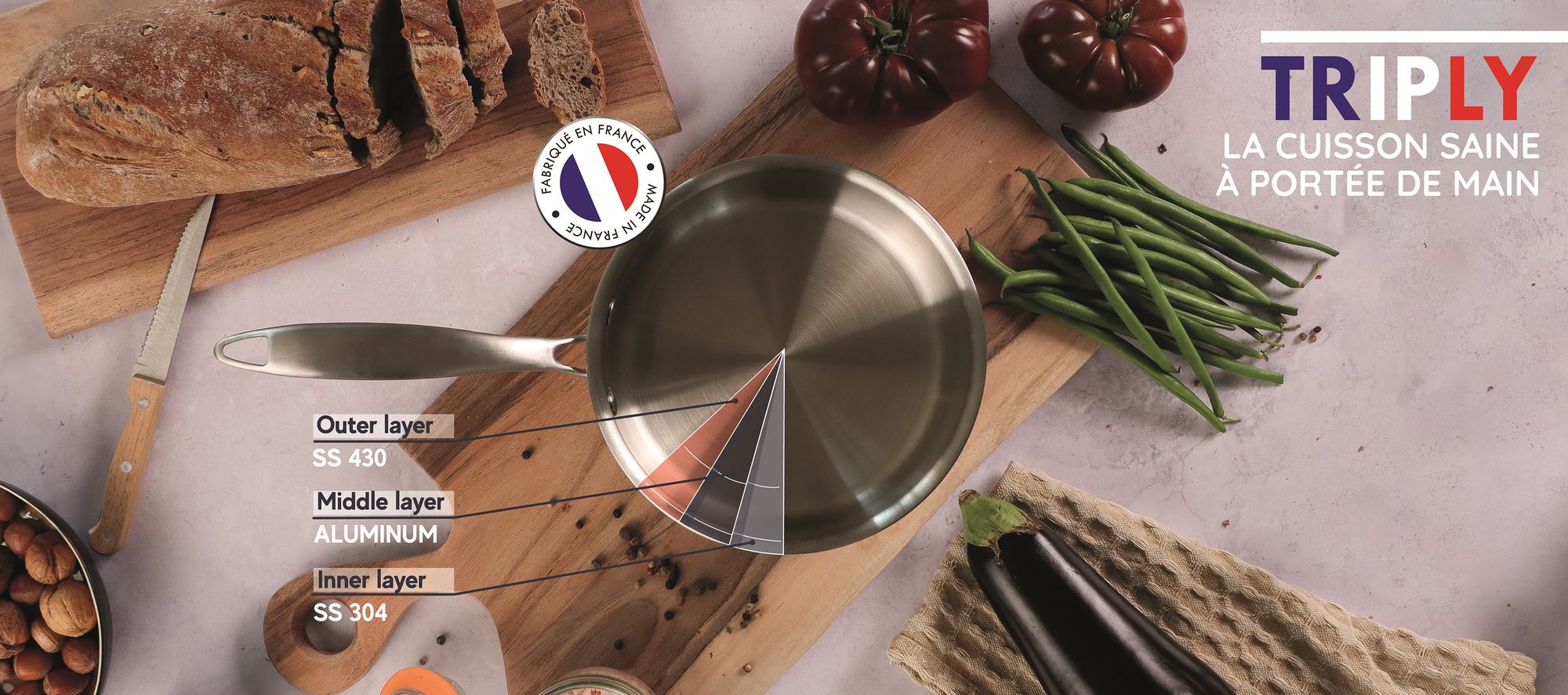 FABRICATION FRANÇAISE PREMIUM : Chaque ustensile (poêle, casserole, wok, faitout, sauteuse) de la gamme Triply Menastyl est fabriqué en France, gage de qualité, de savoir-faire artisanal, de longévité, et contribue à limiter l'empreinte carbone.