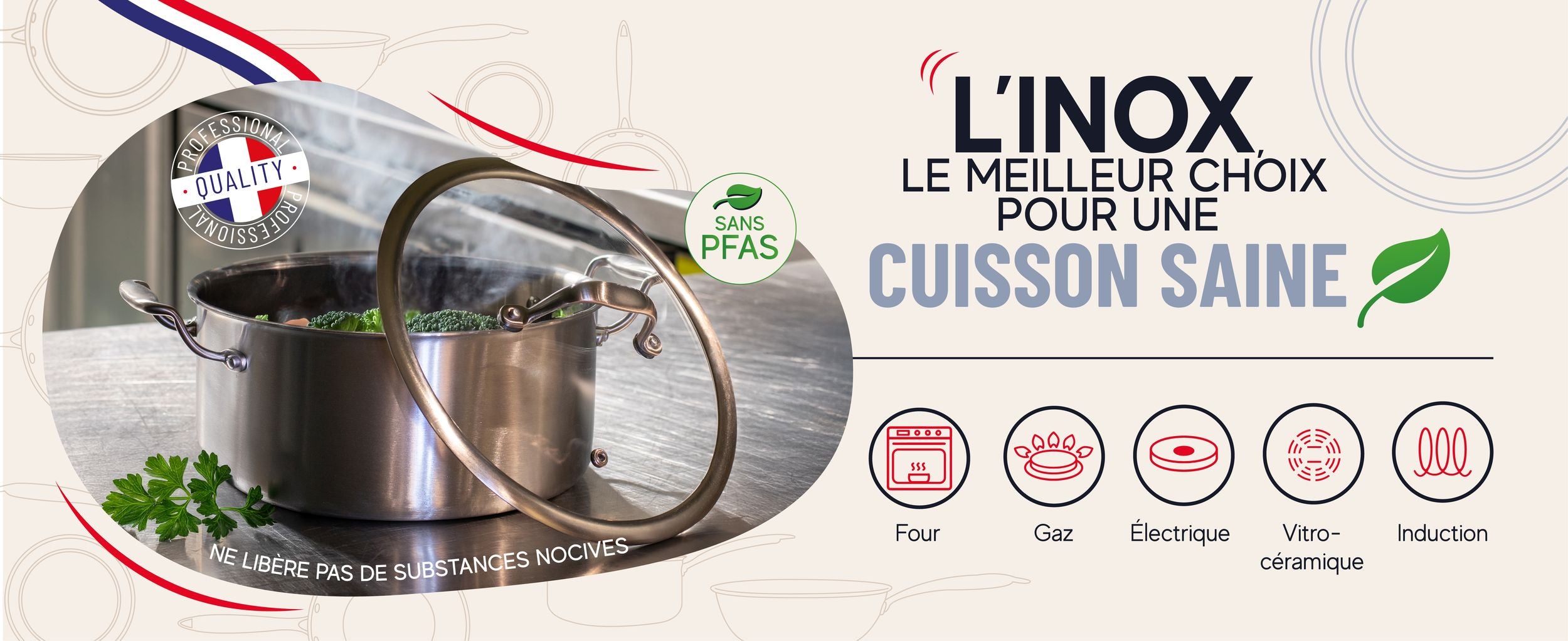 ROBUSTESSE ET CONFORT : L'acier inoxydable assure une durée de vie maximale. Les poignées rivetées en inox restent froides même lors des longues cuissons. Solides et ergonomiques, elles offrent une prise en main sécurisée pour un usage quotidien.