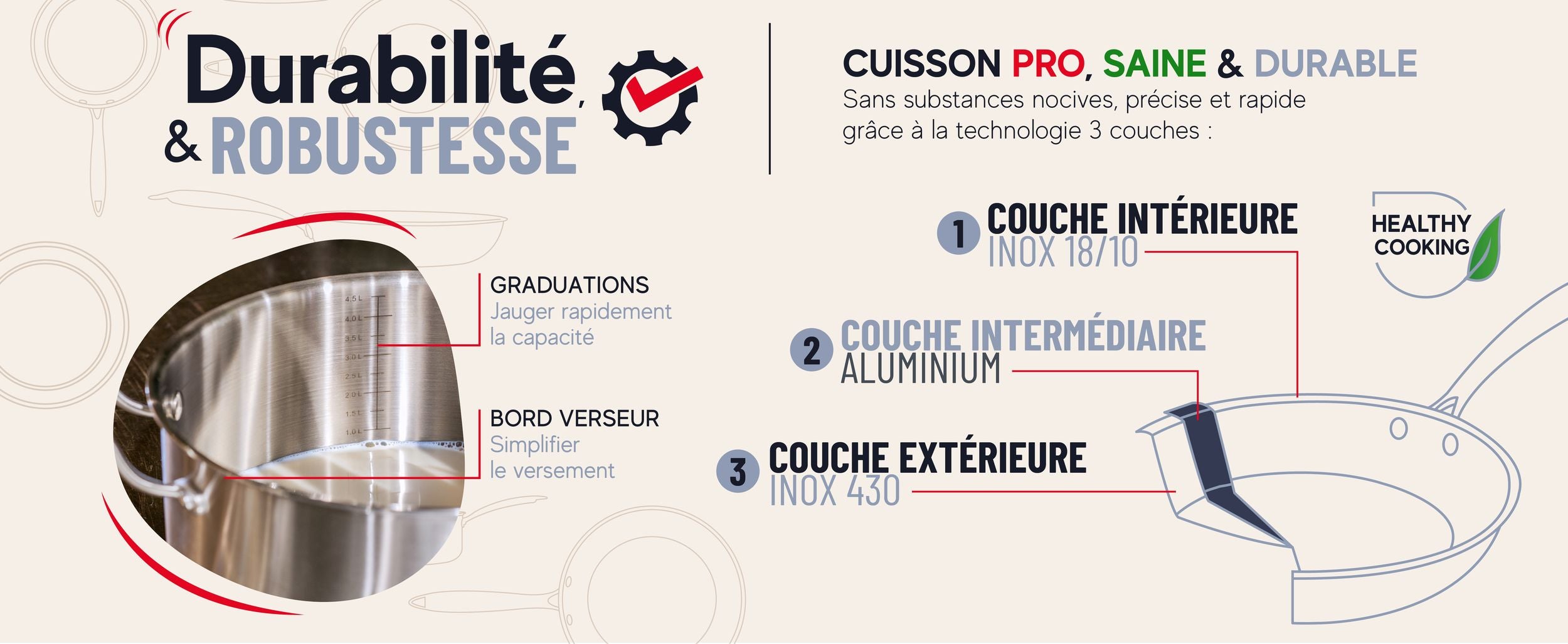 - La couche d'aluminium intermédiaire (1,2mm) offre une diffusion homogène de la chaleur sur l'intégralité du produit, pour des cuissons parfaites sur sur le fond et les parfois.