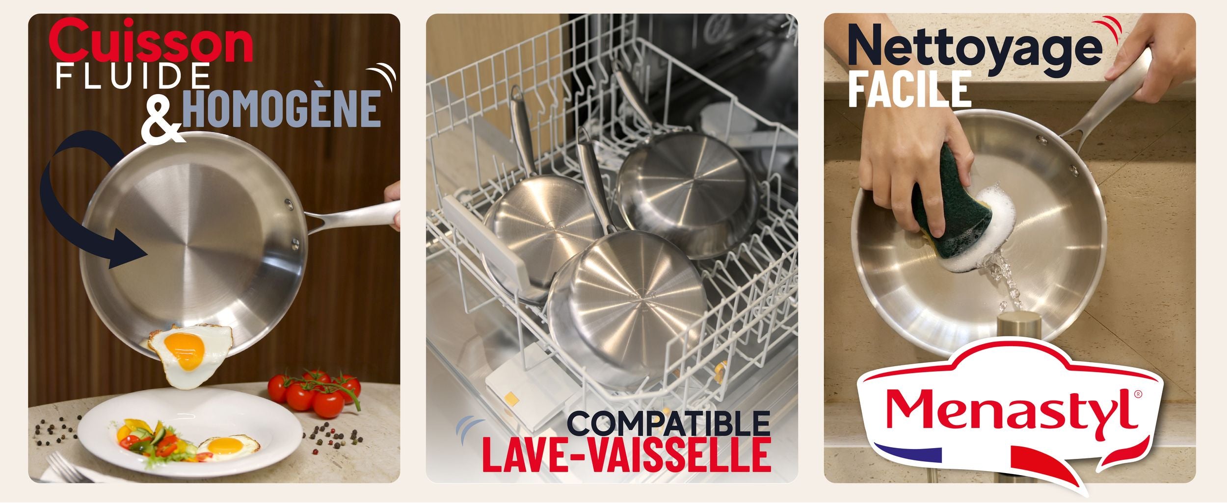 CUISSON HOMOGÈNE ET RAPIDE : Grâce à leur structure 3 couches (inox 18/10, aluminium, inox 304), les ustensiles de cuisson en acier inoxydable Triply Menastyl assurent une chauffe rapide et une diffusion uniforme de la chaleur, du fond aux bords.